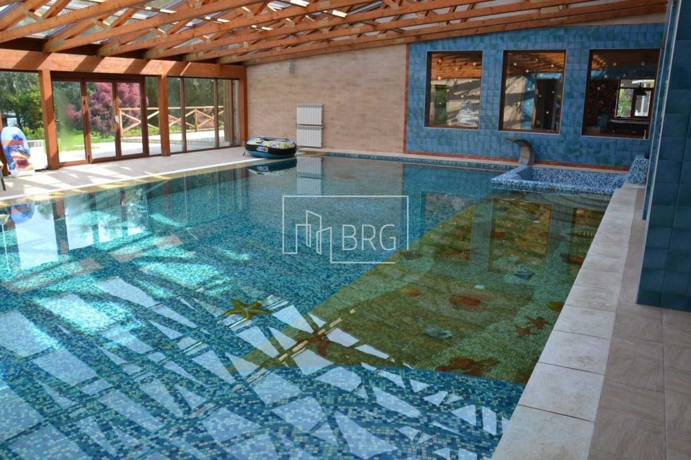 В совместном пользовании гостевой дом 800 м²: крытый бассейн 8х12 метров, каминный зал, бильярд, гостевые и детские комнаты, сауна, хамам, тренажерный зал.