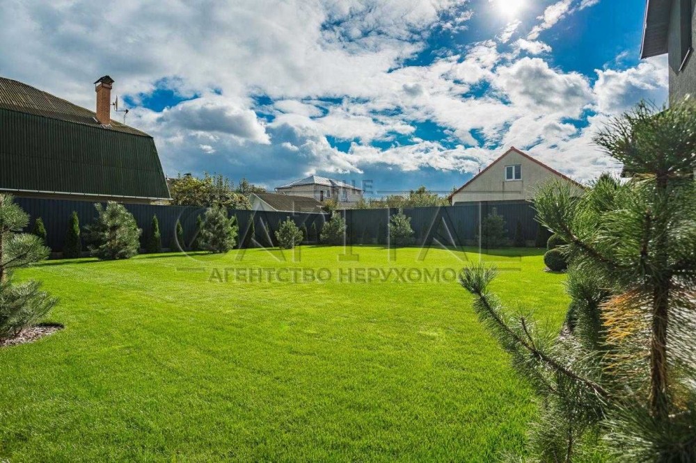 Площа ділянки 10 соток з рулонним газоном, сіткою"антикріт", автоматичним поливом та датчиком дощу. По периметру ділянки висаджено 110 туй та 17 сосен.
