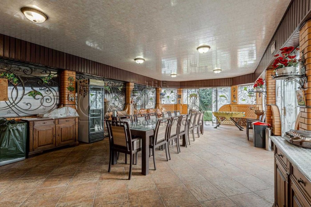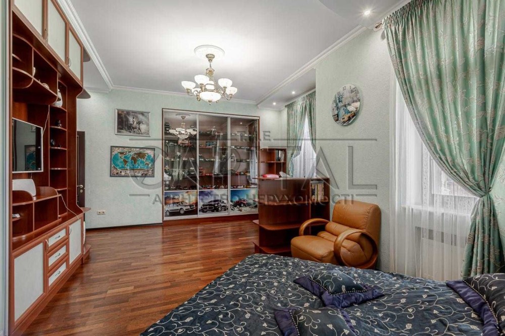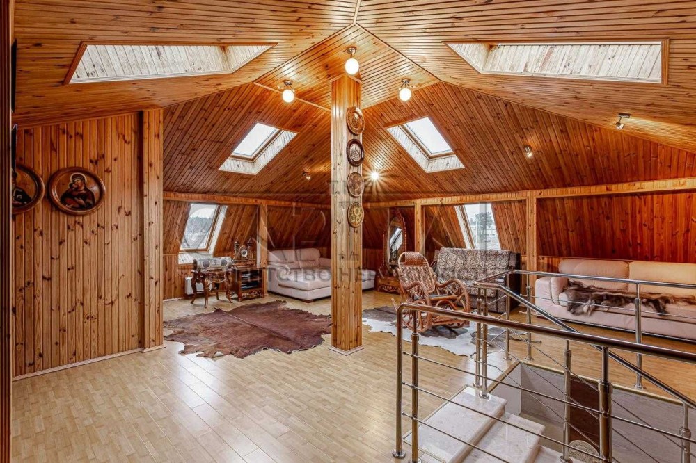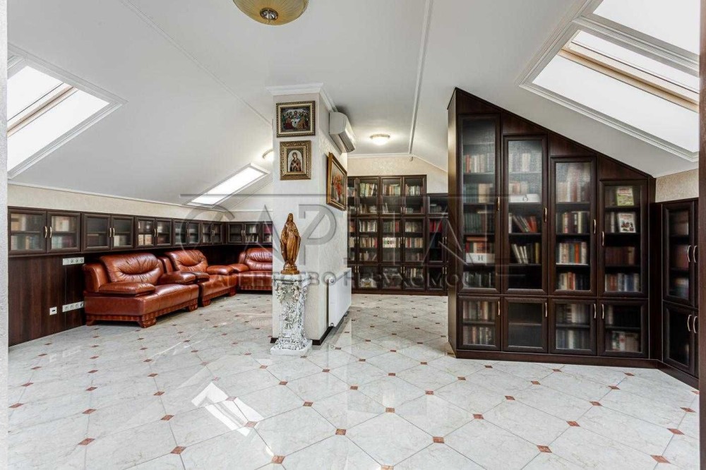 1. Основній будинок (589,4 м2): кількість поверхів чотири (цокольний + 2 поверхи + мансарда), спалень чотири, санвузлів чотири, гардеробів 3 та в кожній кімнаті окремі шафи, технічне приміщення одне, кінозал, спортзал, пральна кімната, більярдна кімната, бібліотека;