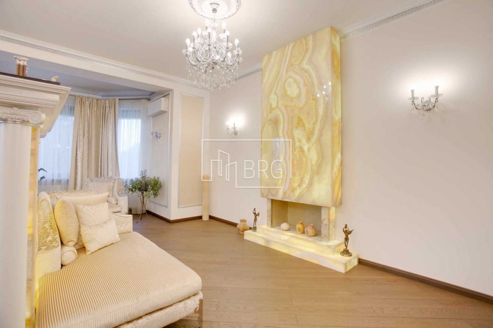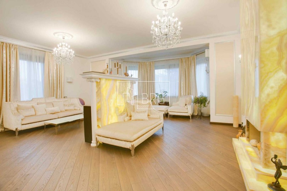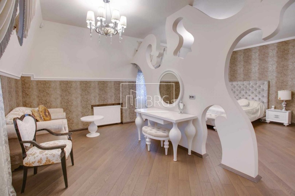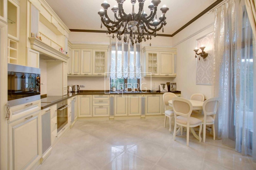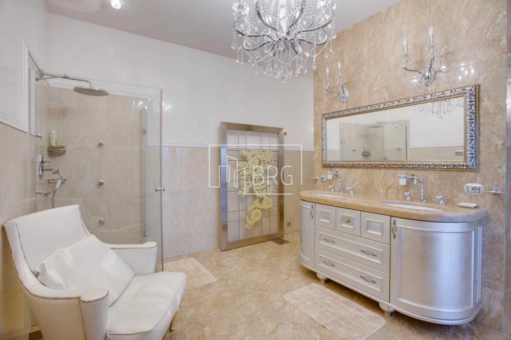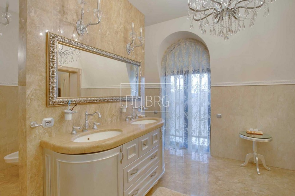 Дизайнерский ремонт. В отделке использованы натуральные материалы: мрамор, элементы декора и камин из оникса, дубовый паркет, натуральная кожа, декоративная штукатурка. Дом полностью укомплектован мебелью и оснащен бытовой техникой, итальянская мебель и светильники, итальянская сантехника.