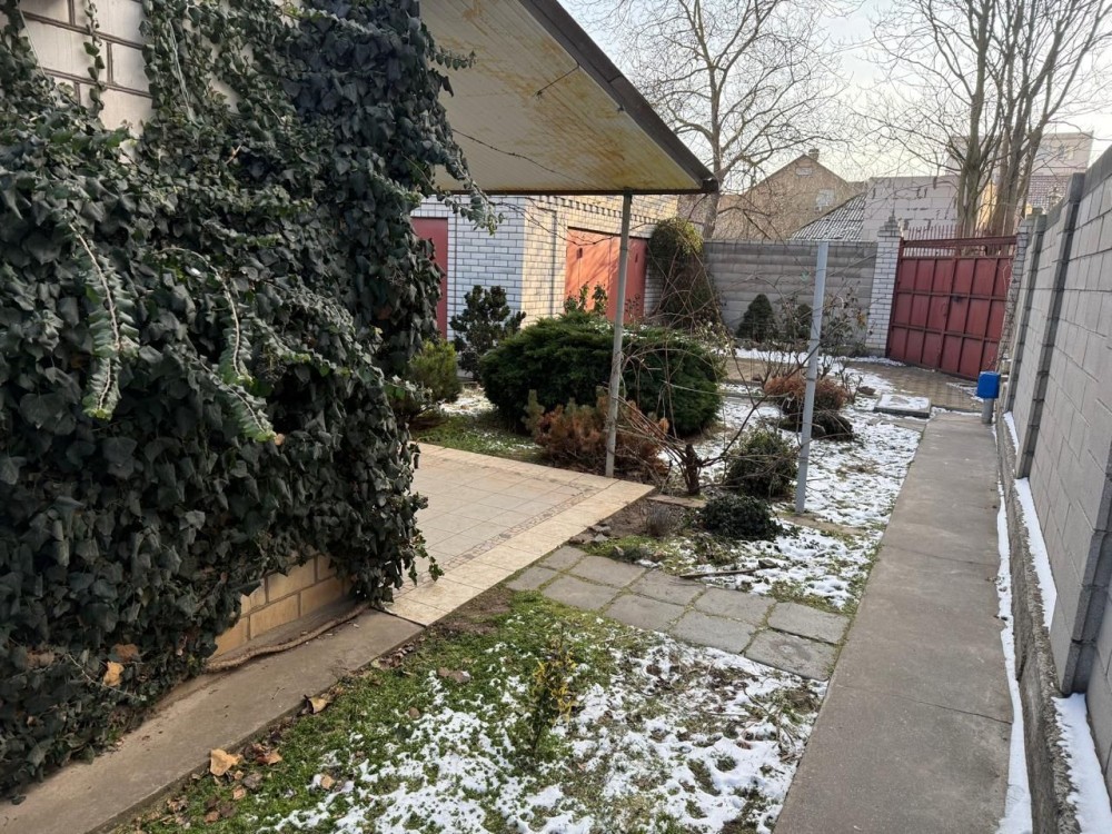 Сам дом построен из ракушника и облицюван белым селикатным кирпичом.