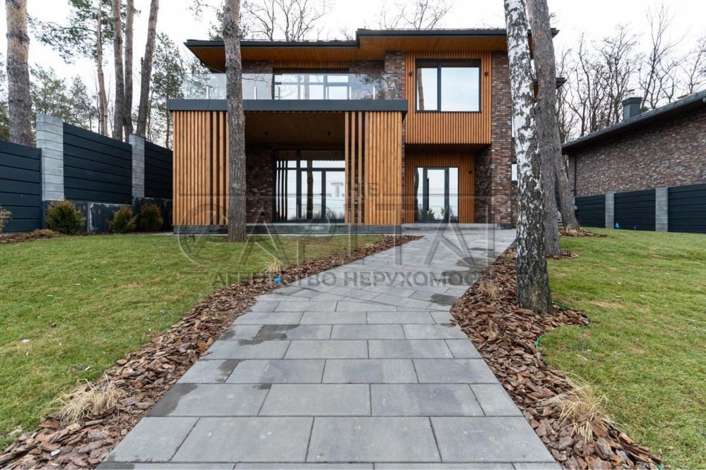 Елегантний котедж з панорамними вікнами, підземним паркінгом на два авто та гаражем. Будинок утеплений і облицьований клінкерною цеглою. Простора тераса з видом на облагороджену ділянку.