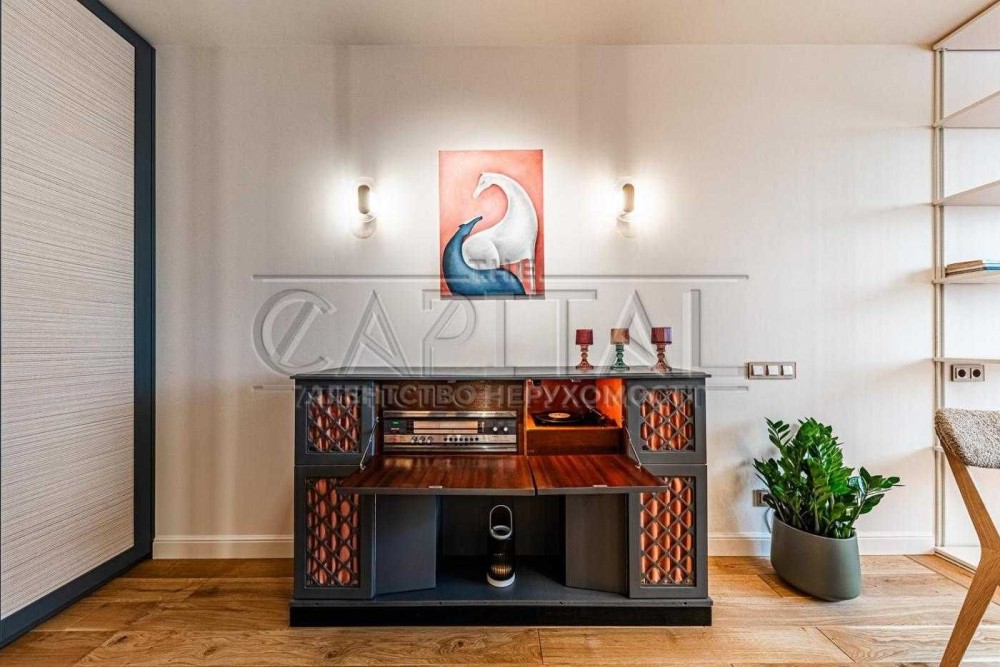 відновлений вінтажний комод з вбудованою аудіо апаратурою, дизайнерські штучно вироблені столи, ручний викрас, стіни під градієнт та штучне покриття паталлю на меблях.