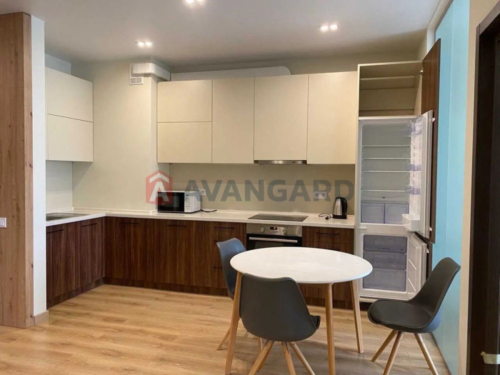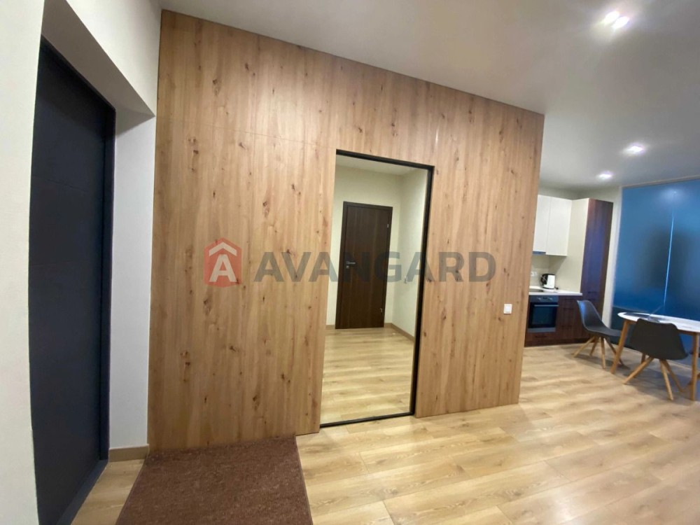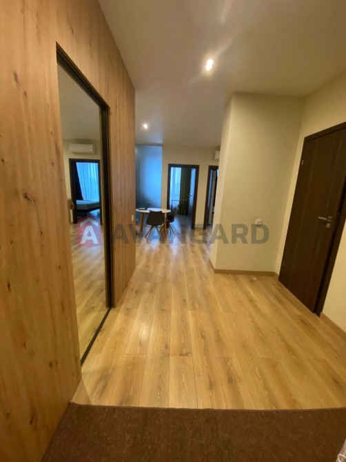 Квартира площею 69 м² розташована на 13 поверсі новобудови бізнес-класу. Планування продумане до дрібниць: кухня-вітальня студійного типу (25 м²), окрема спальня, кабінет (або друга спальня), простора ванна кімната, гардеробна з дзеркалом у повний зріст. Виконано авторський ремонт з використанням якісних матеріалів, усі меблі виготовлені на замовлення.