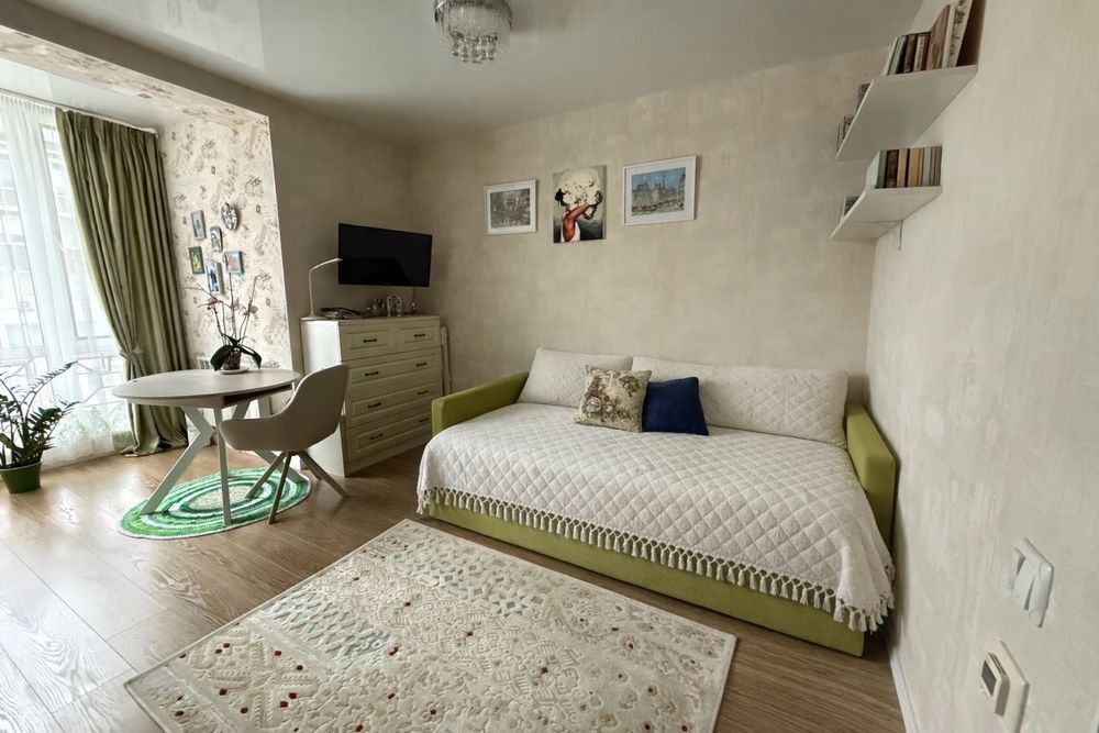 Світла та затишна квартира-студія з ремонтом у комфортному закритому комплексі. Квартира має вдале квадратне планування, що дозволяє зручно зонувати простір на кухонну та житлову частини.
