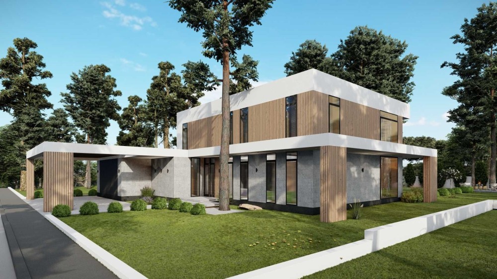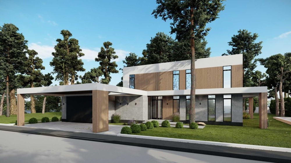 Будинок створений для комфортного життя великої родини та поціновувачів простору. Панорамні вікна відкривають вид на сосни, а тераса стає продовженням житлового простору.
