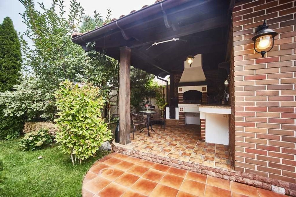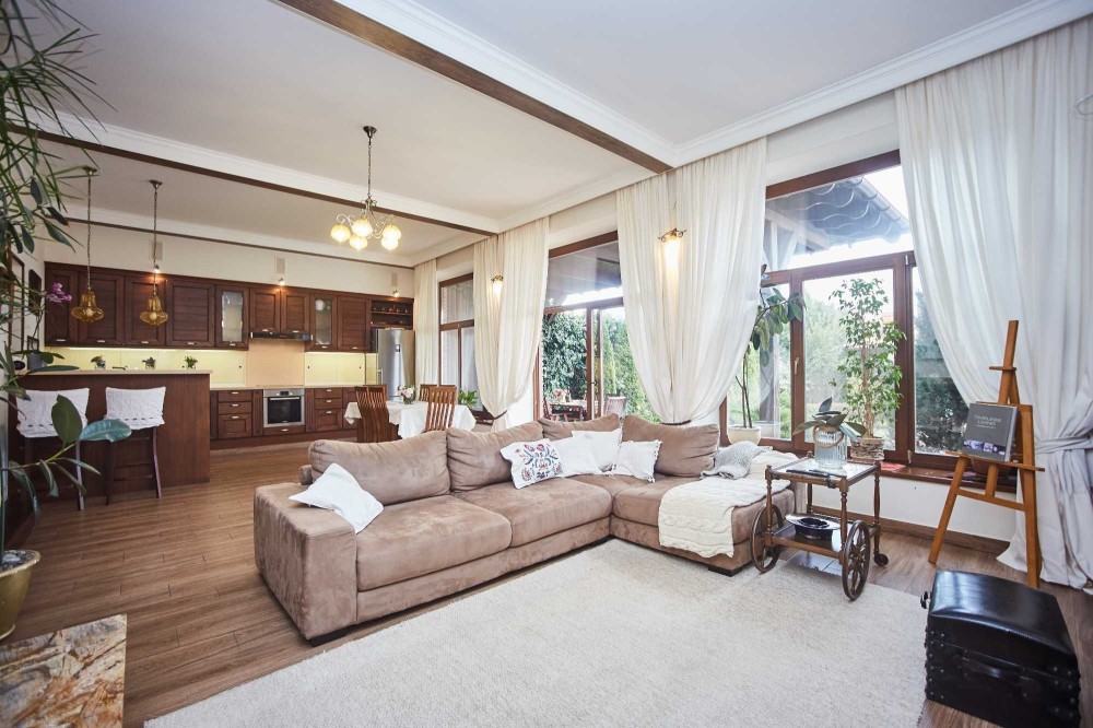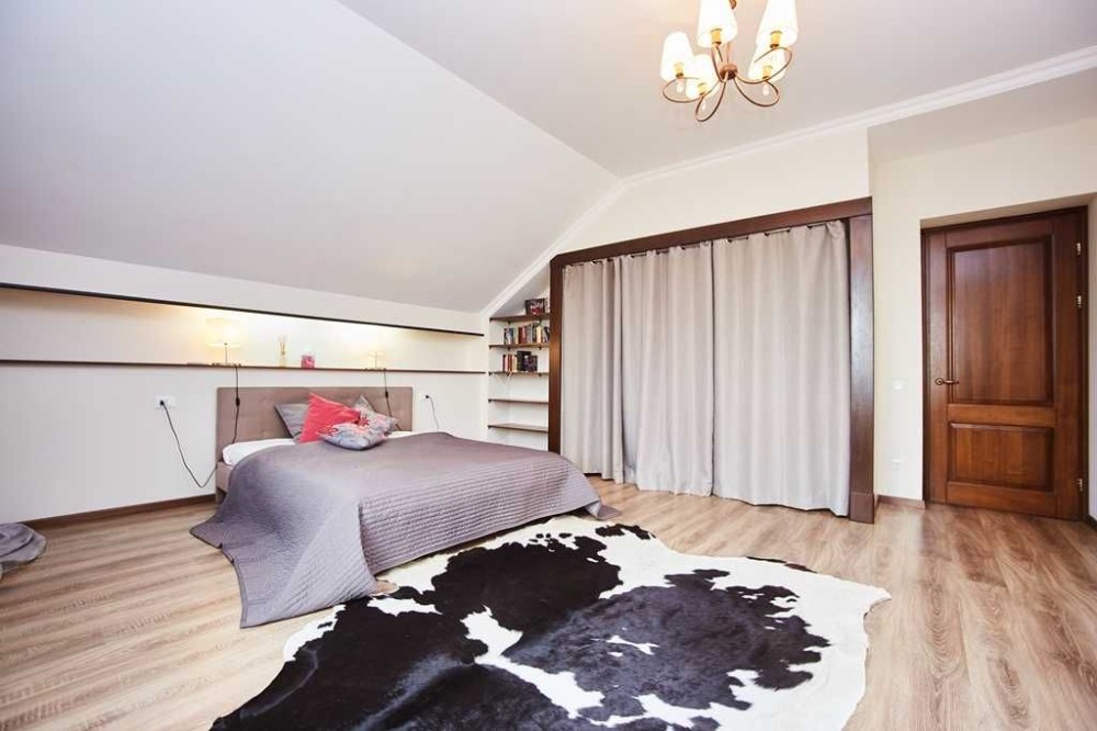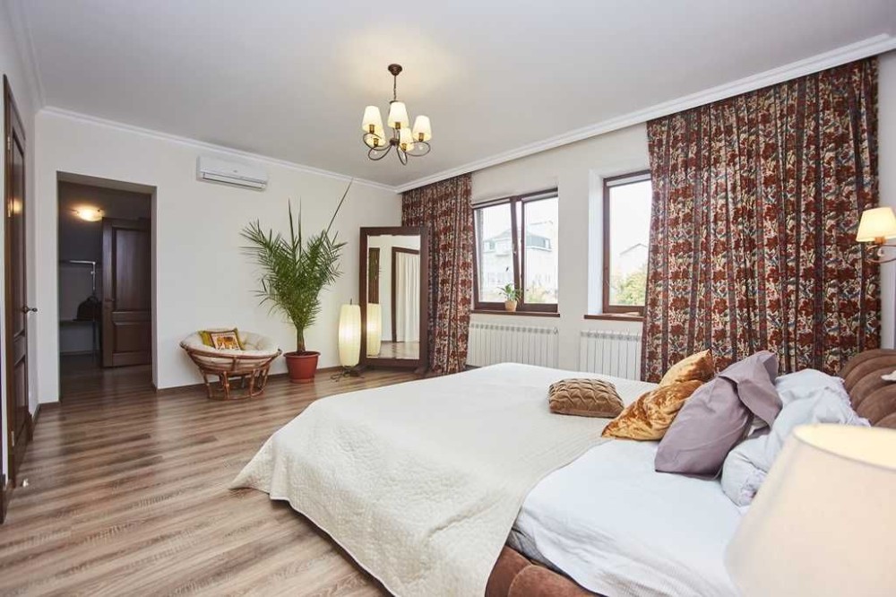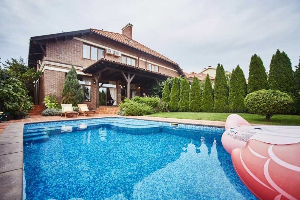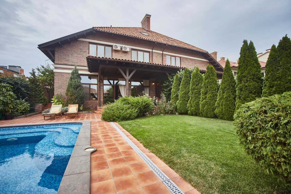 2-х поверховий будинок із мансардою (65,5 кв.м.). Sзагальна = 330 кв.м. S житлова = 80 кв.м. 1-й поверх: передпокій (24,4 кв.м.), кухня-студія (49,1 кв.м.) з теплою підлогою та каміном, тераса (20,9 кв.м.), кабінет (11,3) кв.м.), з/в (5,3 кв.м.), госпблок (15,4 кв.м.), гараж (36,8 кв.м.). 2-й поверх: коридор (6,7 кв.м.), 3 спальні (21,4+26,7+25 кв.м.), 2 з/в (9,6+10,9 кв.м.). ), вбиральня (7,6 кв.м.). Гараж, у дворі відкритий басейн 4х8 та лазня. Стіни – газобетон (400мм) + облицювальна клінкерна цегла (120мм), перекриття – монолітний залізобетон (200мм),покрівля – керамічна черепиця, вікна та двері – дерев'яні вироби фірми «Термінус» з подвійними склопакетами. На даху встановлені сонячні батареї та антени супутникового TV, виконано озеленення зі штучним поливом. Ландшафтний дизайн.