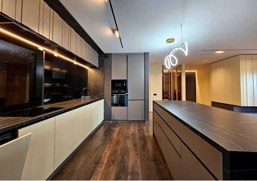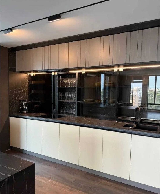 - Кухня оснащена технікою Hansa: духовка, мікрохвильова, варильна поверхня, посудомийка — усе в єдиному чорному скляному стилі.