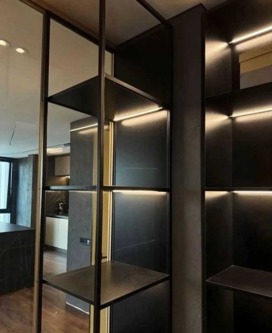 Передбачена гардеробна зі скляними фасадами, з підсвіткою.