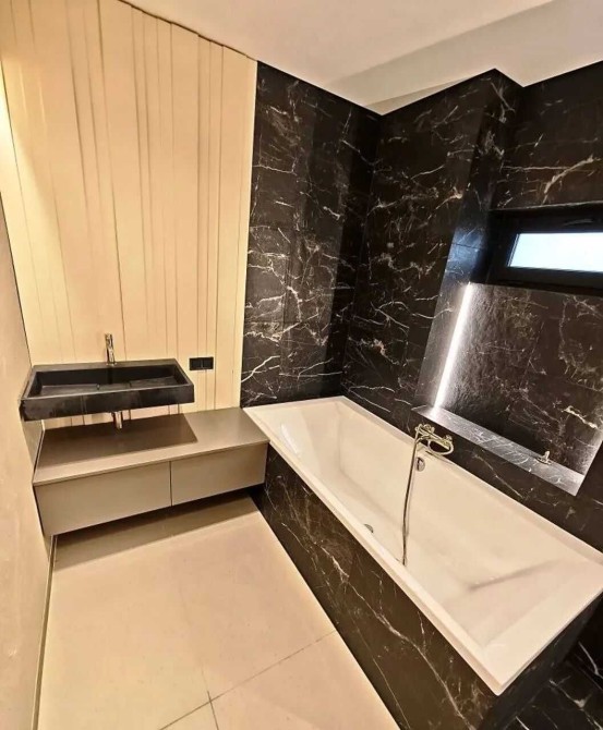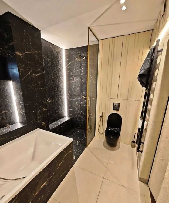 - У ванній кімнаті встановлена інсталяція, дизайнерська рушникосушка, ванна та душ із безбарєрним доступом.