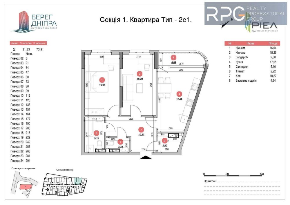 Загальна площа квартири 73,91 м², поверх – 24/28.