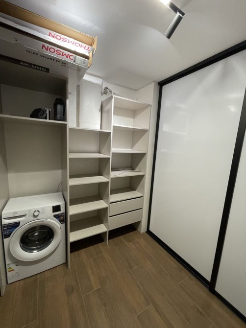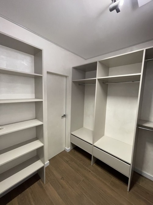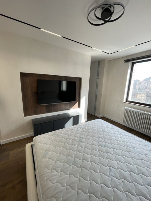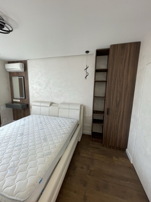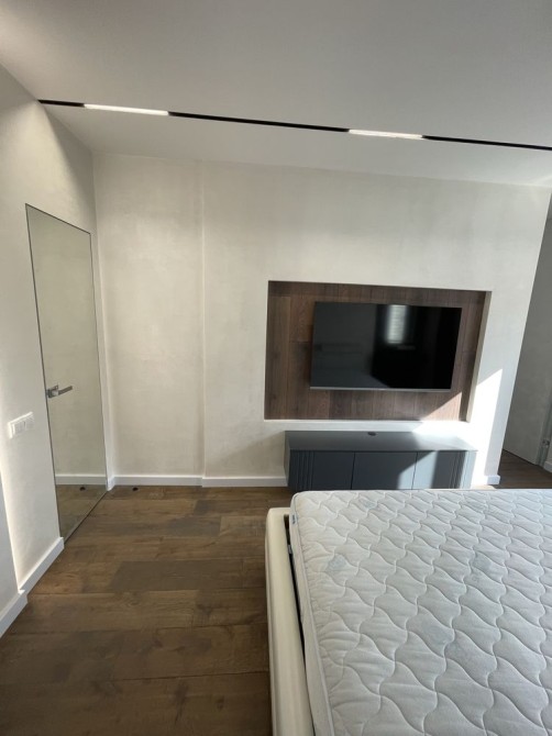 В квартирі спальна кімната з двоспальним ліжком, гардеробною та с/в з ванною.