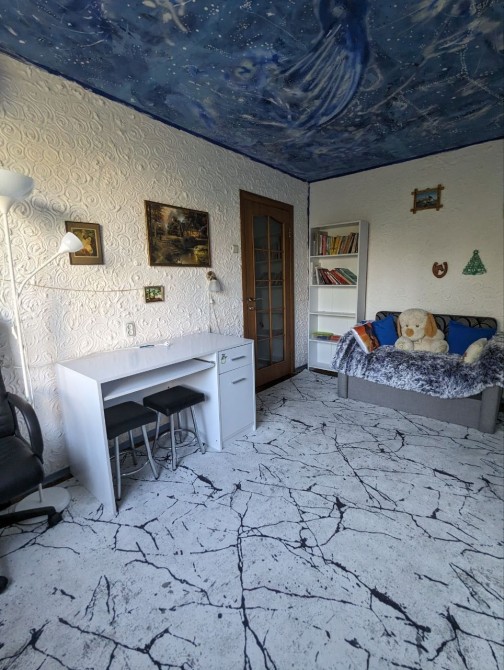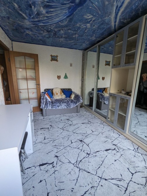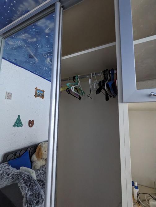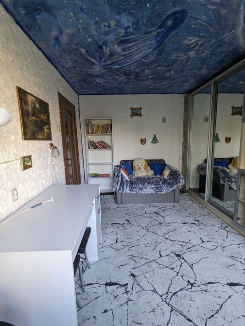 Раскладной удобный диван, большой шкаф на всю стену, на потолке звёздное небо, как ночник, это очень красиво !