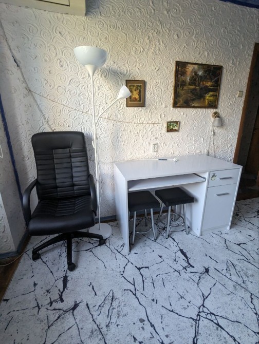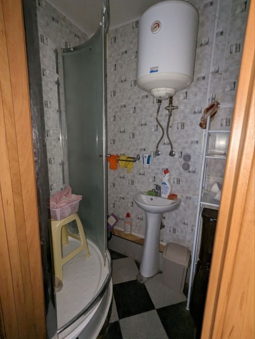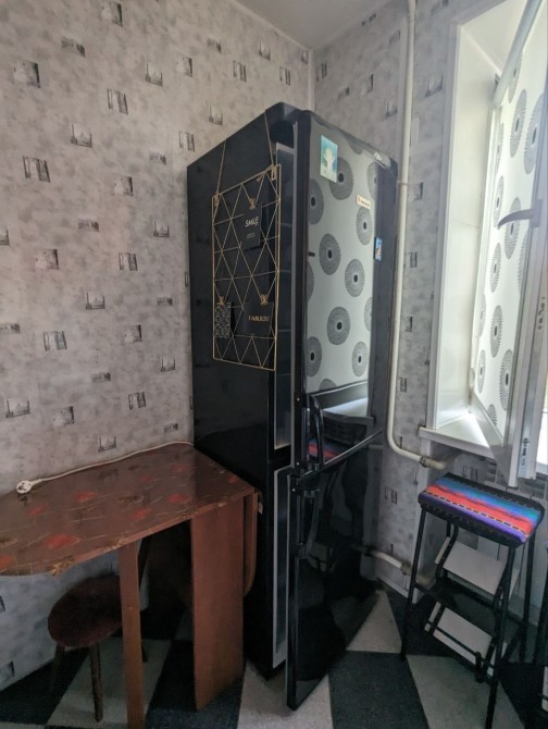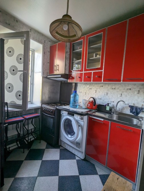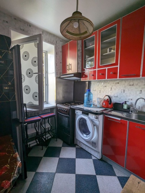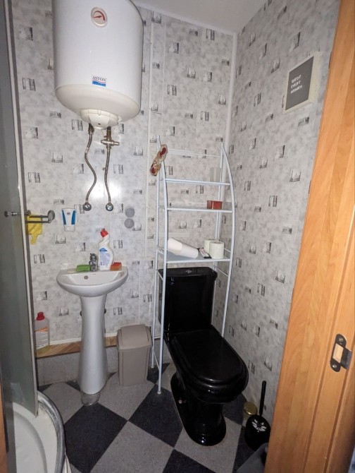 Санузел смежный с душевой кабиной, необычный чёрный унитаз, полностью укомплектованная кухня с газовой плитой и новым большим холодильником, есть рабочая зона стол и кресло !
