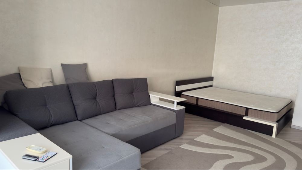 Отдельно спальная с двуспальной кроватью,хорошим матрасом и диваном,который раскладывается.