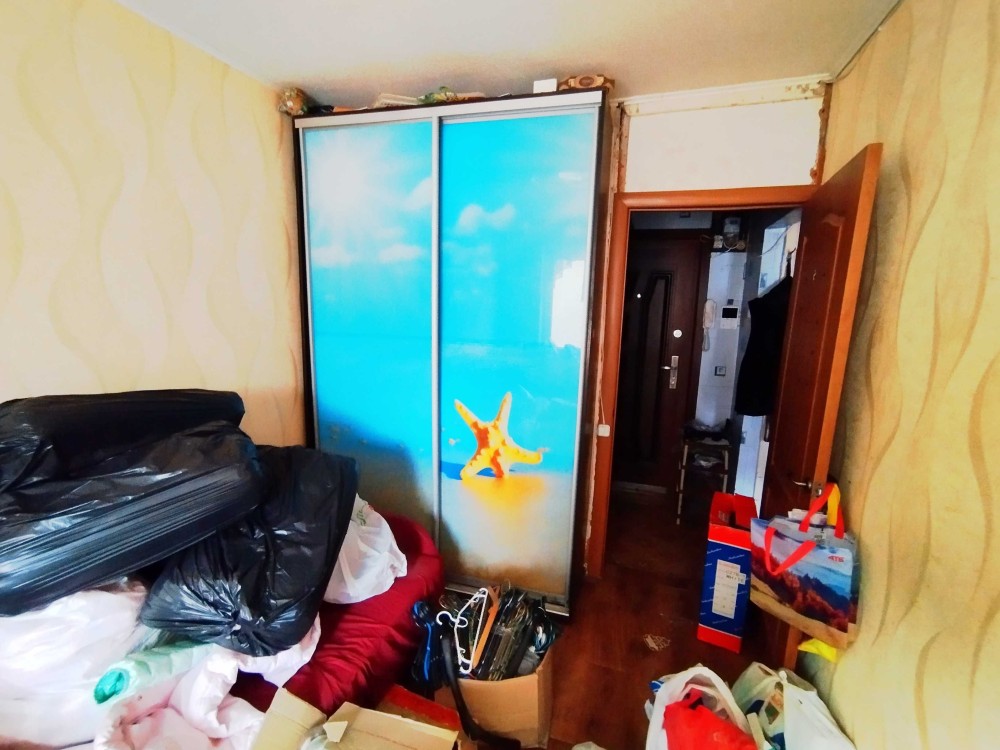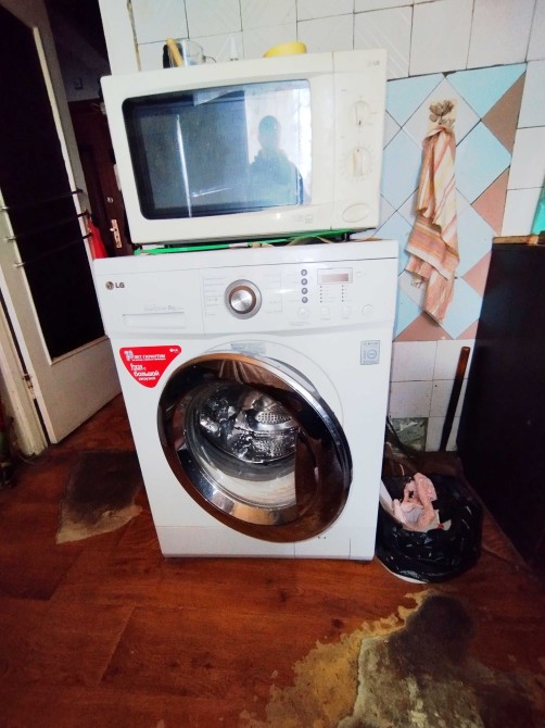 Минимум мебели, диван и детское раскладное кресло, стиральная машина, холодильник.