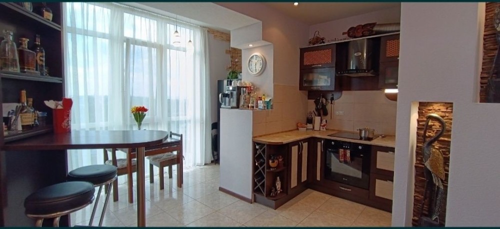 Кухня - гостинная с диваном, две спальни , лоджия и балкон, панорамное остекление. Теплые полы. Много удобных шкафов . Вся техника.