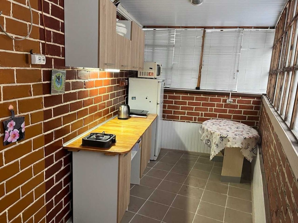В кухне новая мебель оснащена всем необходимым для приготовления еды (2-комфорачная газовая плита с балоном, 1-комфорочная индукционная, микроволновка, холодильник, эл. чайник).