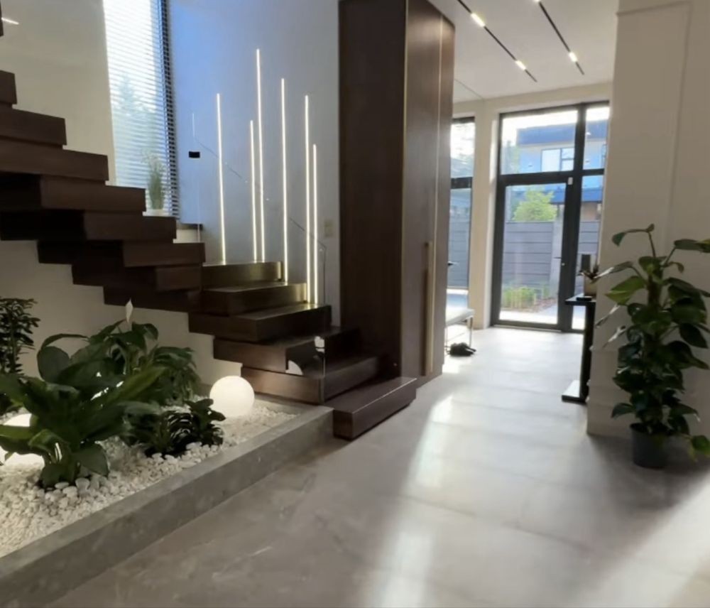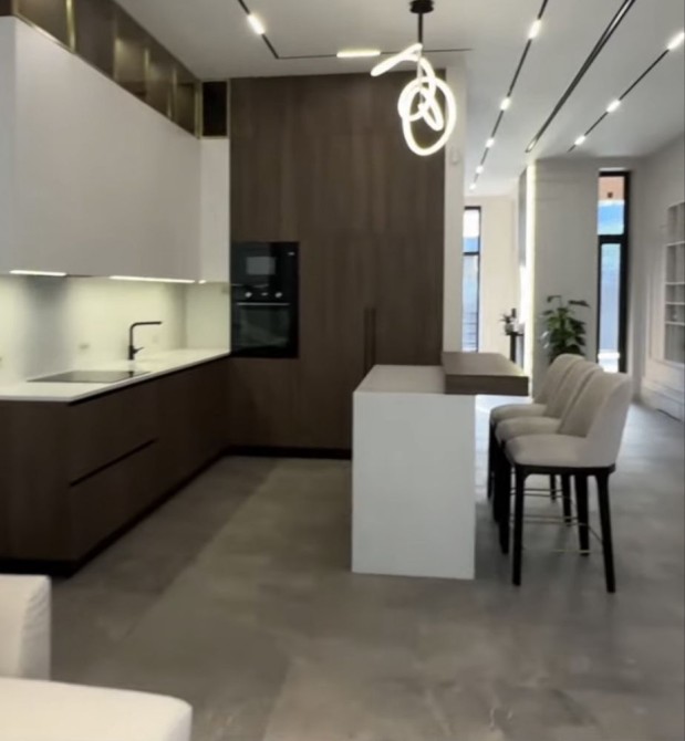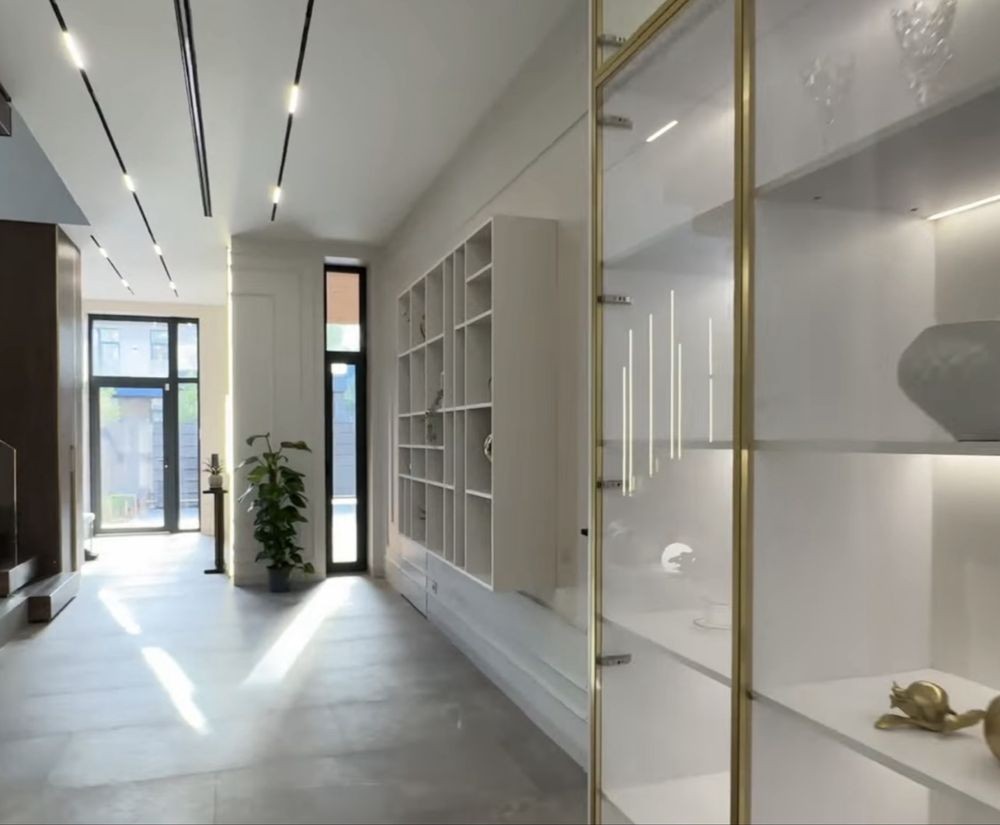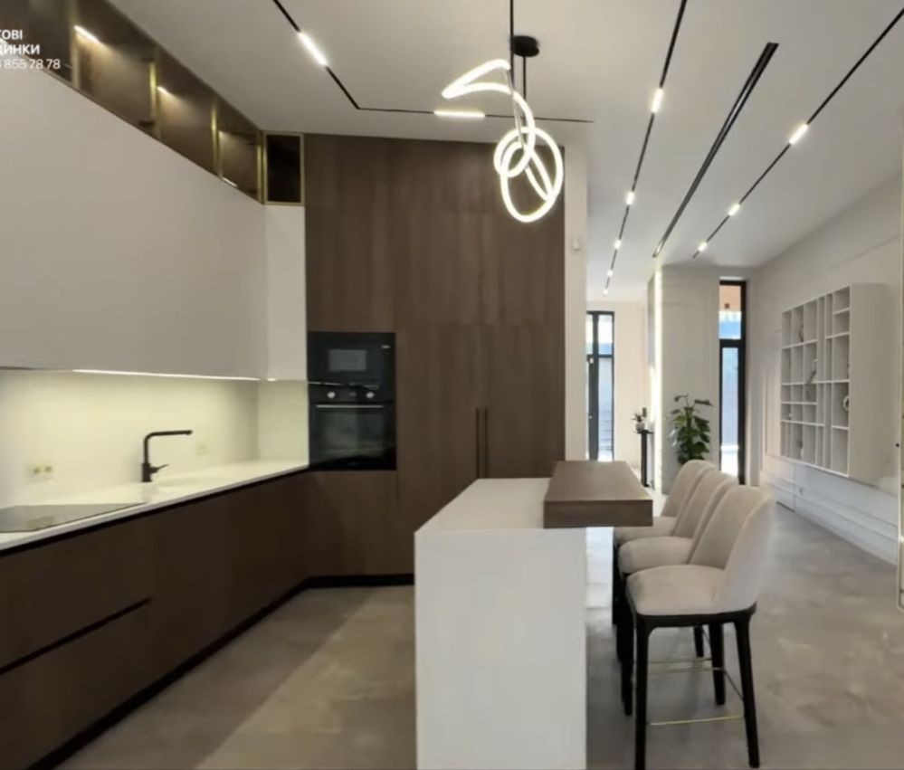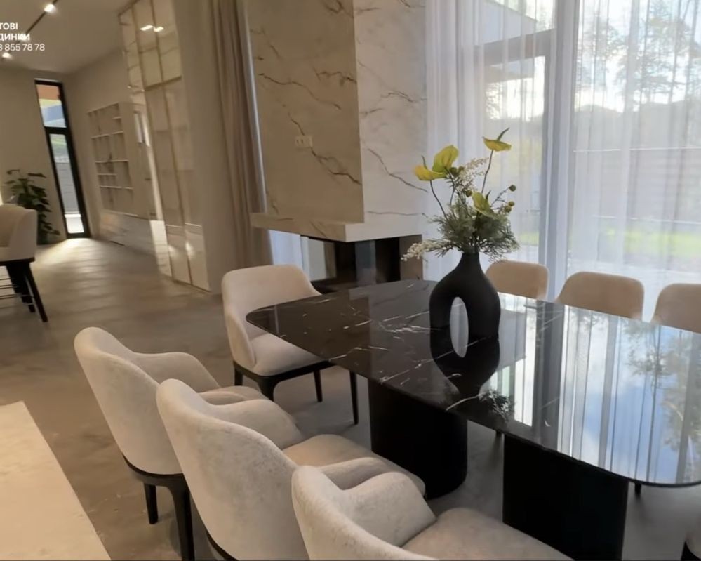 - вітальня з високими стелями, панорамними вікнами, світлими тонами та дизайнерськими меблями. Оздоблення з натурального дерева та скла створює атмосферу затишку й елегантності;