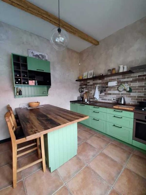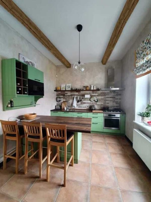 Проект построен в уютном стиле Шале с использованием натуральных высококачественных материалов - деревянные полы, двери и кухня, каменный камин и полки.