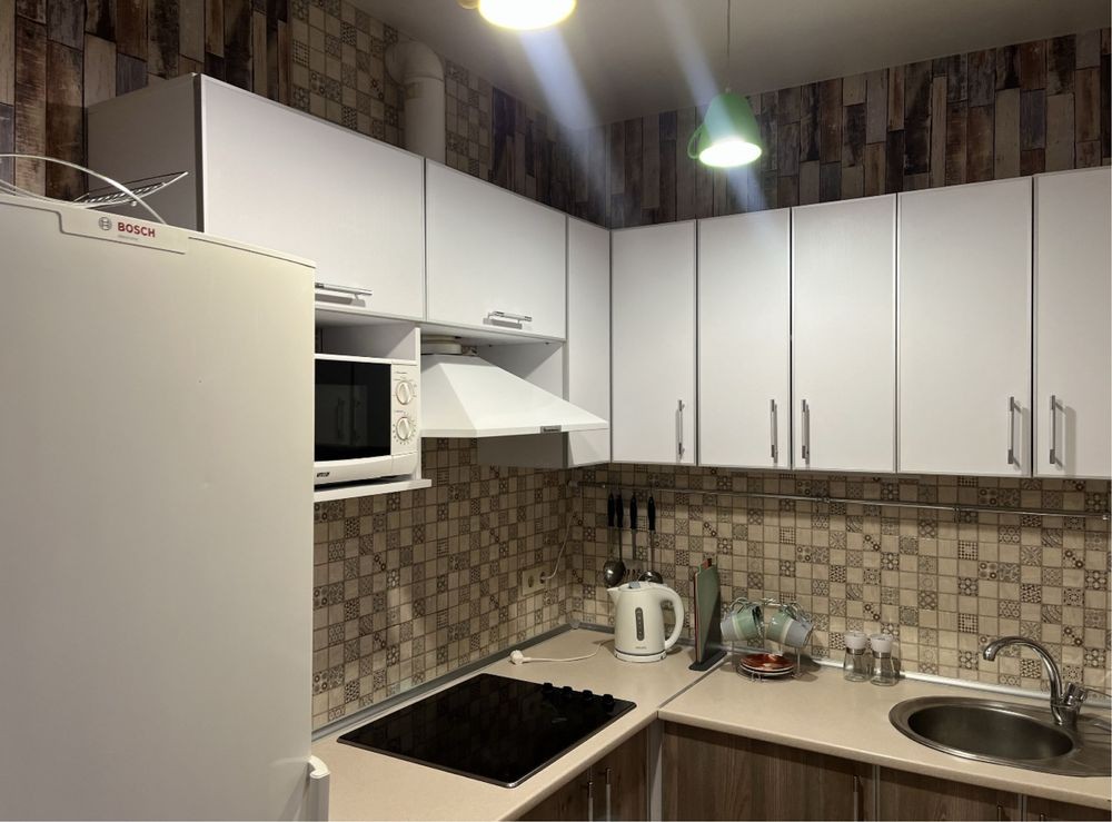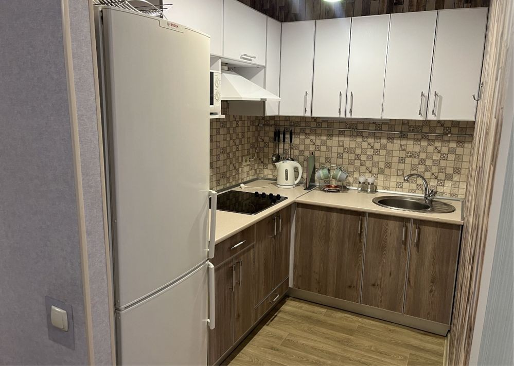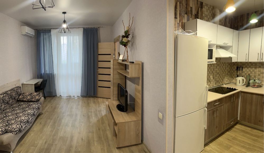 новобудові в районі Одеської, Зернової, ЖК Макіївський. Простір поділений на 2 кімнати з кухнею у середині зі всім необхідним для комфортного життя у тихому районі. За 3 хв пішого ходу від зупинок на проспекті Аерокосмічному, до метро Левада 10 хв міським транспортом. Поряд всі супермаркети і ринок. У квартирі вся необхідна техніка і всі затишні дрібниці на самий перший час, включаючи постіль, рушники, посуд і інше