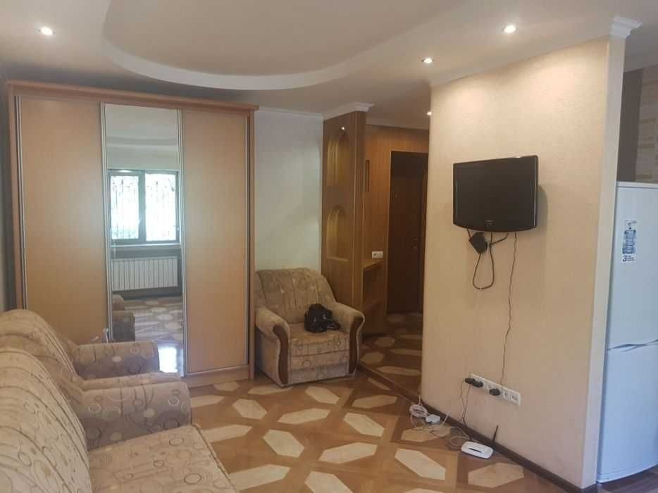 Хороший ремонт, двуспальный диван, шкаф, встроенная кухня, современная облицовка в сан узле, есть вся необходимая техника - ТВ плазма, холодильник двухкамерный, стиральная машина, бойлер, WI-FI, на окнах решетки, без балкона!