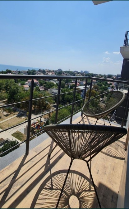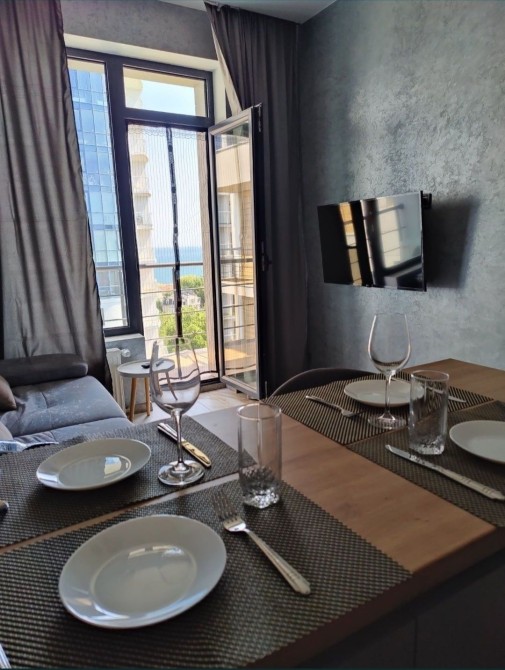 Кухня-студия и спальня отдельно, открытый балкон с видом на море.