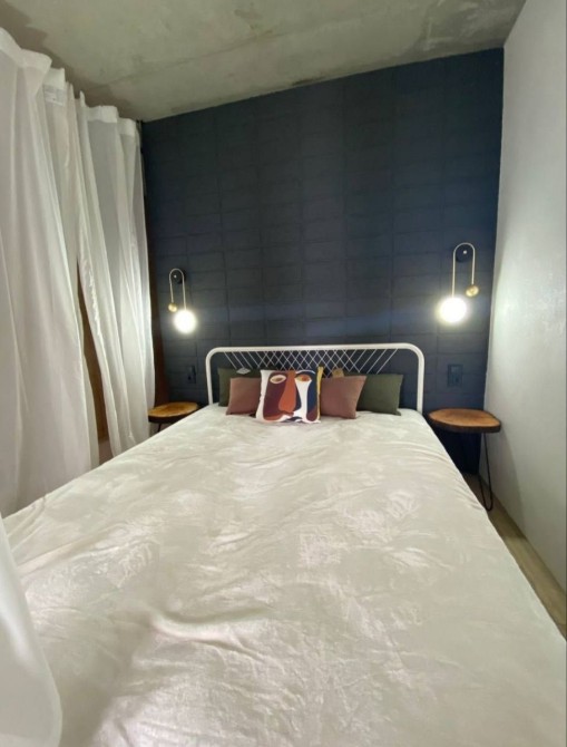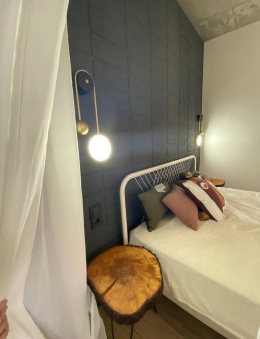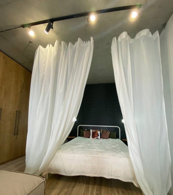 Кровать отделена лёгким текстильным балдахином. Это простой приём, но он создаёт ощущение отдельного пространства, маленького личного мира внутри студии.