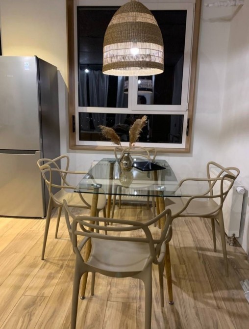 Рядом — стеклянный стол у окна, место для завтраков, разговоров и тихих вечеров.
