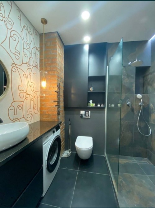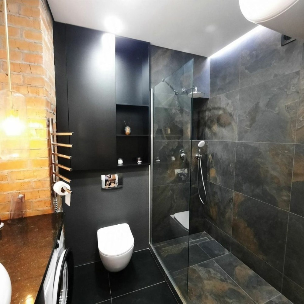 Санузел сделан в тёмной лофтовой эстетике: