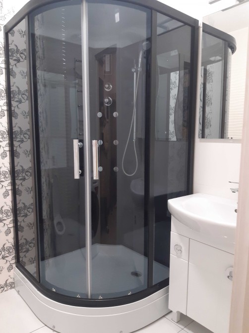 Вся мебель и техника новая. Функциональный раскладной диван с ортопедическим матрасом, кондиционер, холодильник, стиральная машина – автомат, телевизор – плазма, душевая кабина, Интернет.