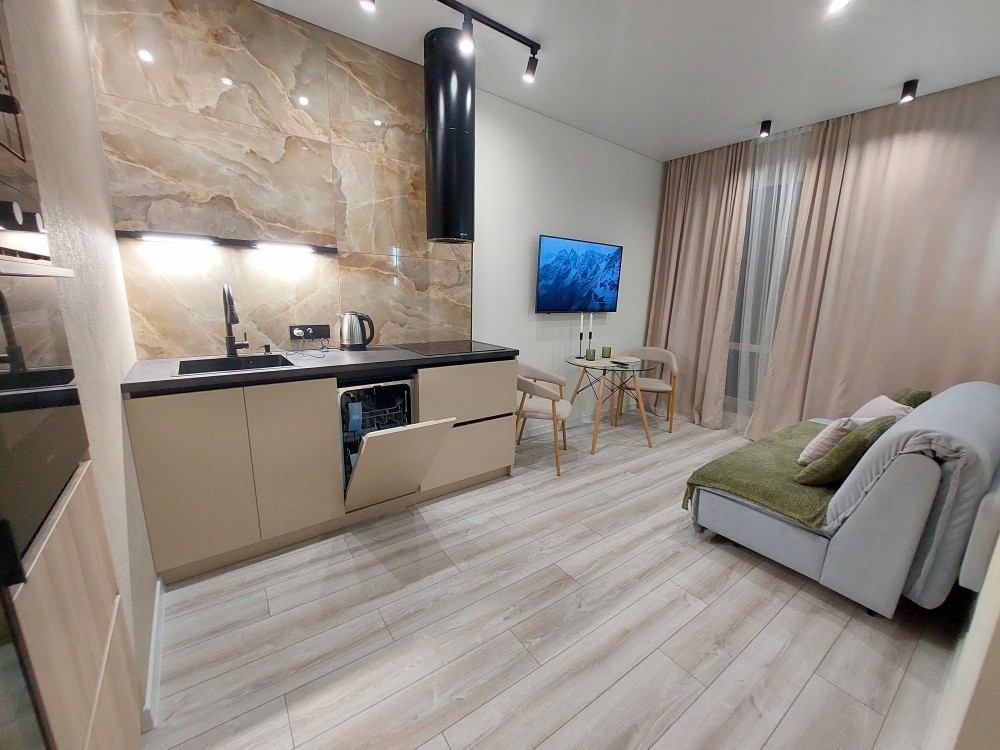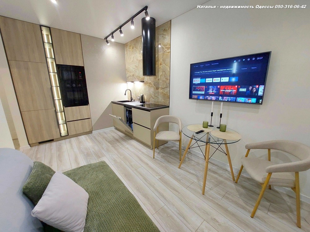 Просторная КУХНЯ-ГОСТИННАЯ со всей быт техникой, комфортным 2сп диваном, смарт тв и столом круглой формы,