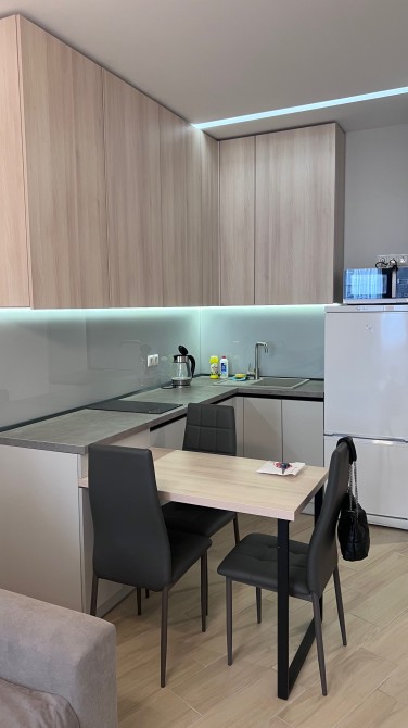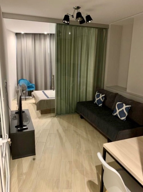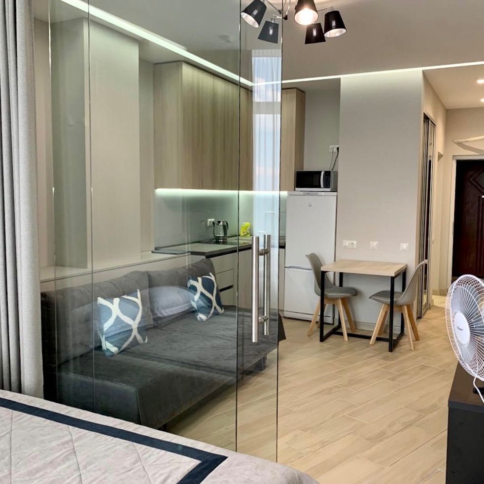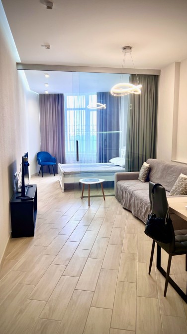 Квартира общей площадью 35 м.кв. Студийного типа. Расположена на 7-ом этаже комплекса и окнами выходит в сторону моря. Большая гостиная с кухней с выделенной зоной спальни, большой санузел, есть гардеробная. Есть все необходимое для комфортного проживания и отдыха. Состояние квартиры полностью соответствует фотографиям.