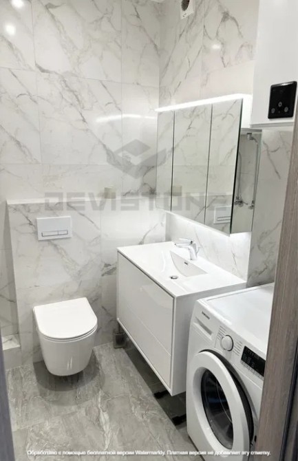 Санвузол оформлений у світлих тонах та укомплектований дорогою сантехнікою: