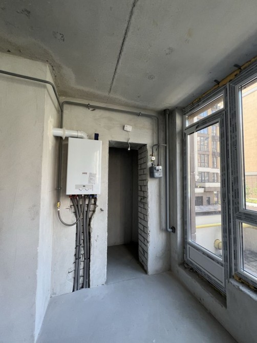 На кухні з лоджією тепла підлога, всі лічильники (газ, вода, світло), двох контурний газовий котел, чернова штукатурка на стінах, лазерна стяжка на підлозі, радіатори в кімнатах.