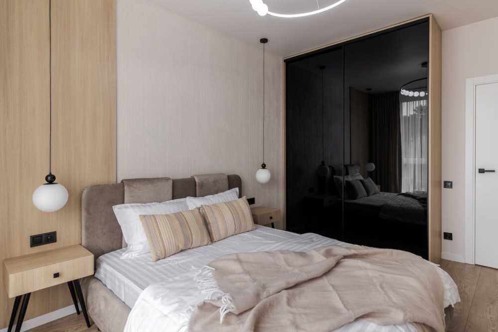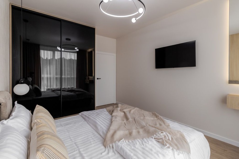 • квартира облаштована всіма необхідними меблями ( спальня з ліжком і шафою та кімната з розкладним диваном і шафою ) + великий диван в кухні , вмонтовані кухонні меблі ;