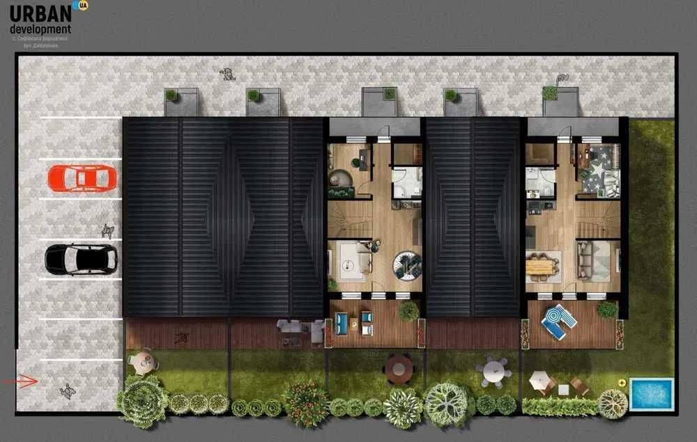 - 1-й поверх: кухня - вітальня з виходом на власний дворик, гостьова кімната, санвузол