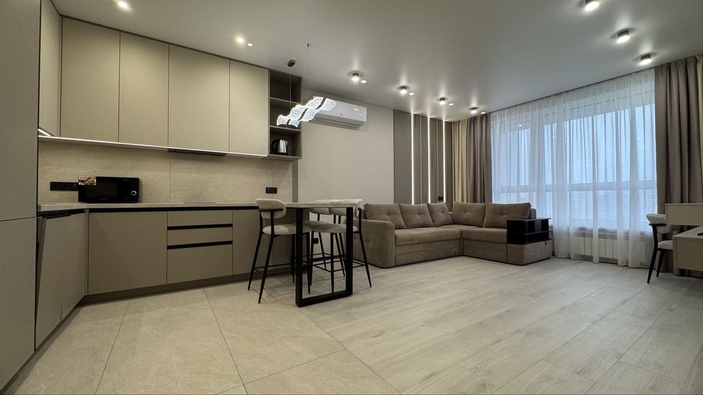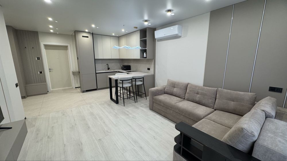 Велика кухня-вітальня (розкладний диван) робочий стіл, вбудована техніка (посудомийна машина) кондиціонер телевізор смарт