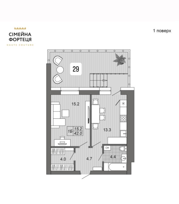 1 к квартира 43 м.кв + тераса 29 м.кв