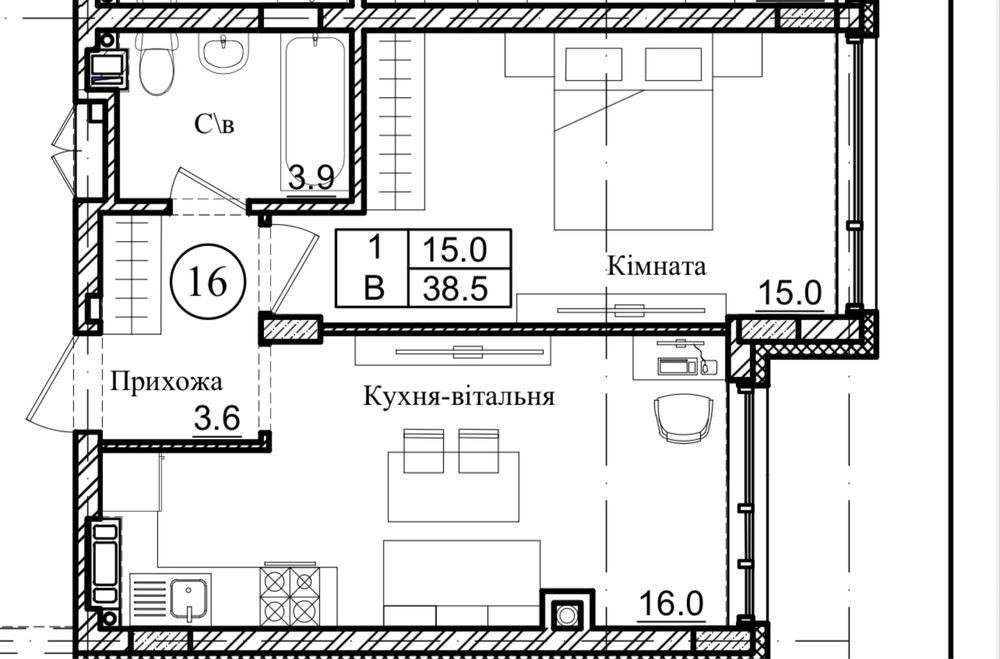 • Загальна площа 38.5 м2