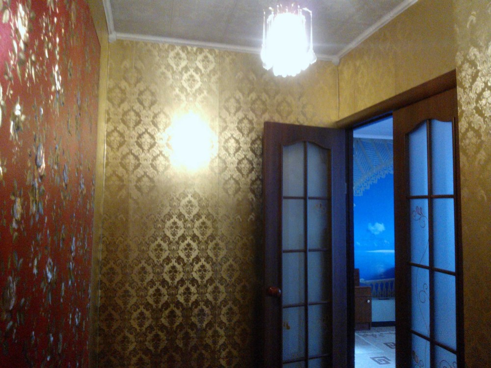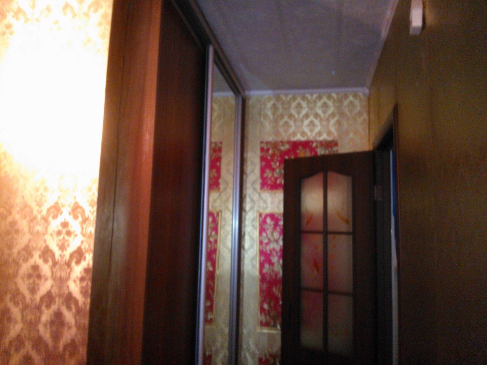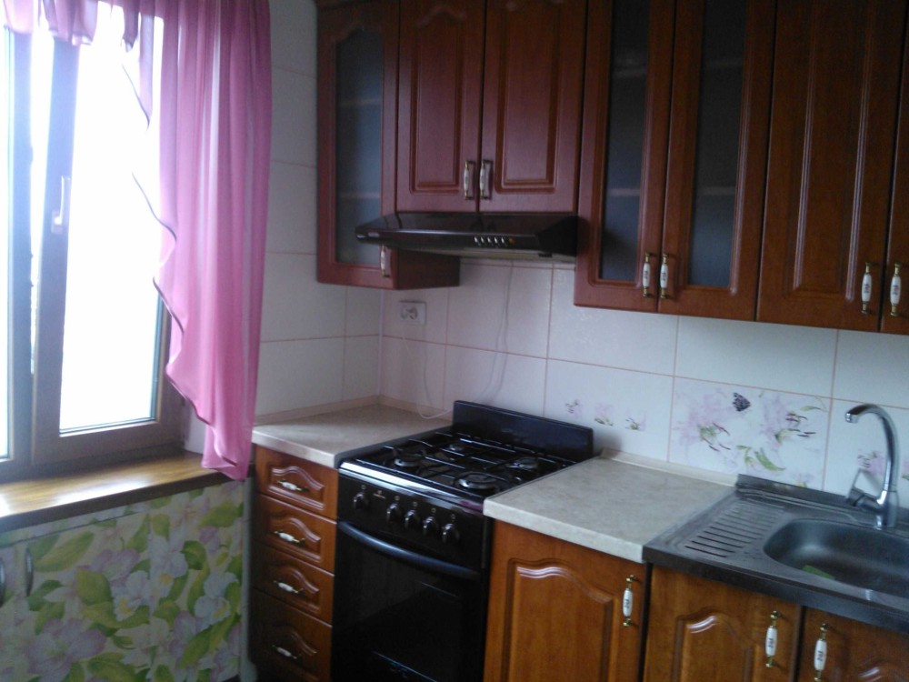 Квартира з меблями (кровать, кухня, шкаф-купе, кухонний уголок, комод) та технікою ( холодильник, бойлер, пральна машина, телевізор). На підлозі скрізь ленолеум.