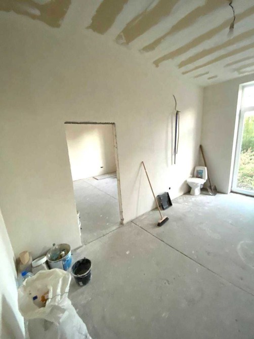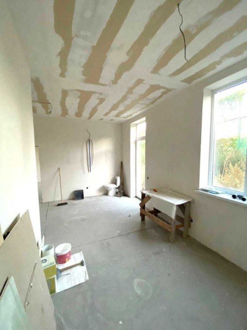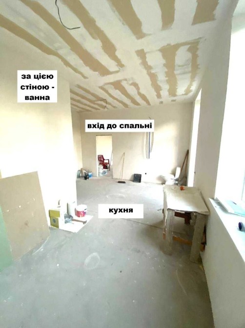 - Кухня і спальня - стіни готові до фарбування, на стелі гіпсокартон.