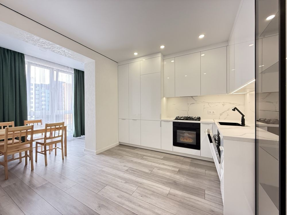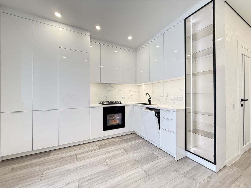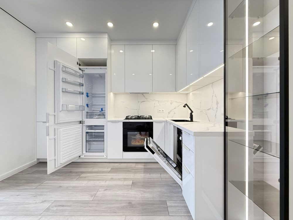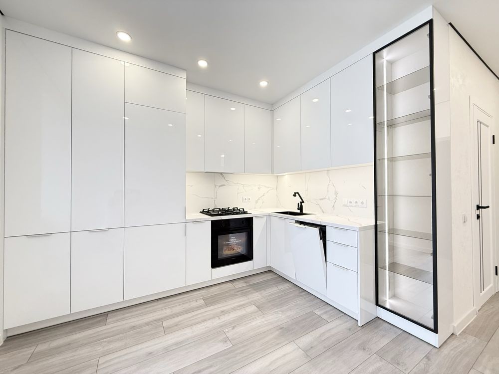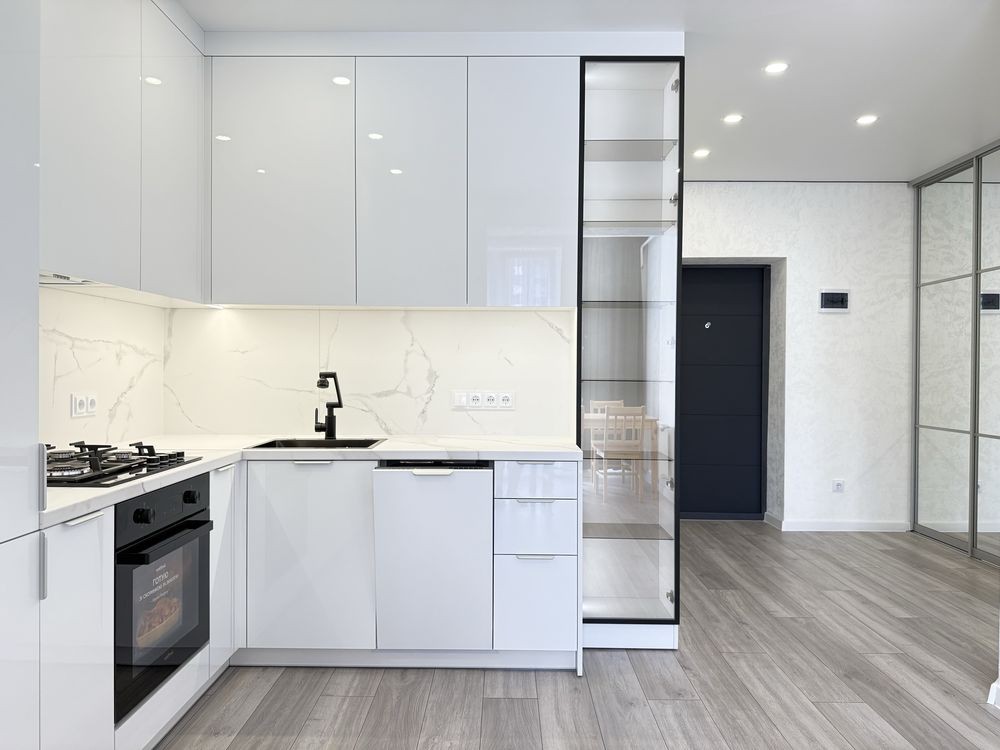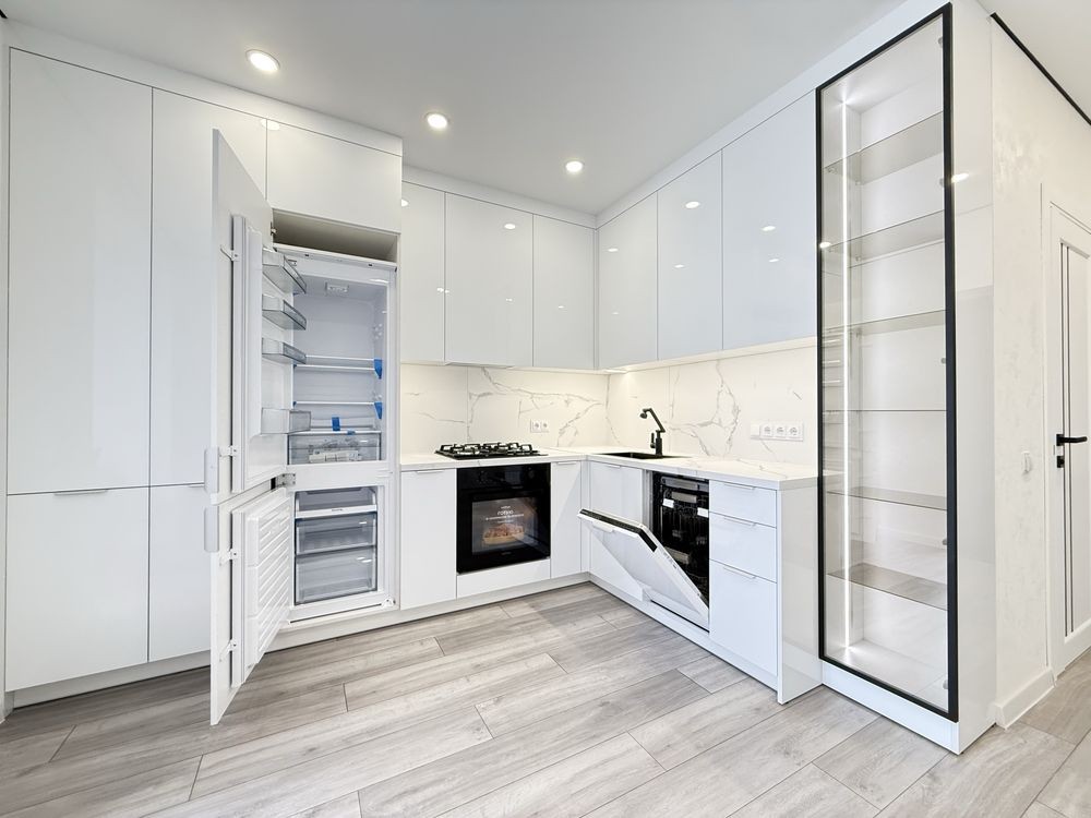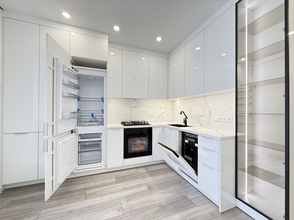 Ремонт зроблений з якісних матеріалів. Функціональна, простора кухня з вбудованою технікою: холодильник, посудомийна машина, духова піч, газова плита.