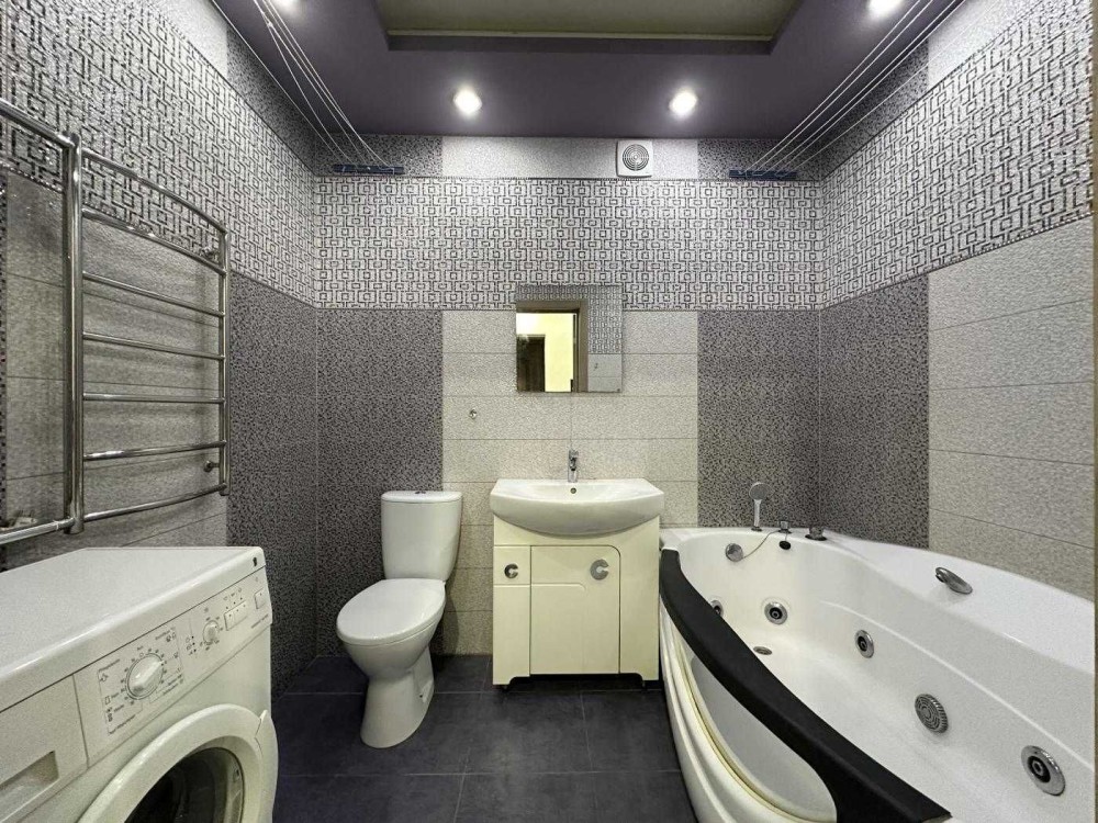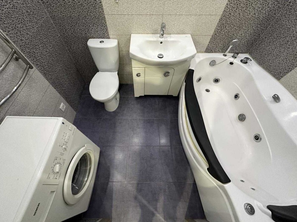• Санвузол 4,5 кв.м. з гідромасажною ванною, умивальник з тумбою, унітаз, пральна машинка автомат, сушка для рушників.