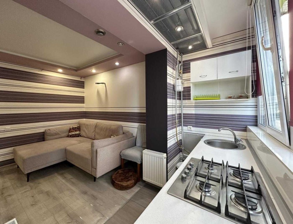 • Кухня-вітальня 14,8 кв.м. обладнана всім необхідним. Встановлена вбудована кухня, укомплектована необхідною побутовою технікою: газова варильна поверхня, холодильник, двоконтурний газовий котел; обідній стіл зі стільцями. У вітальній зоні встановлений великий розкладний диван.