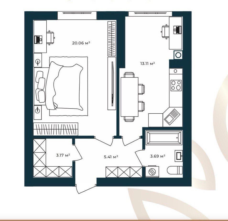 Зручне та функціональне планування: кухня-вітальня 13 м2 , кімната 20 м2, санвузол 4 м2 та окремий гардероб
