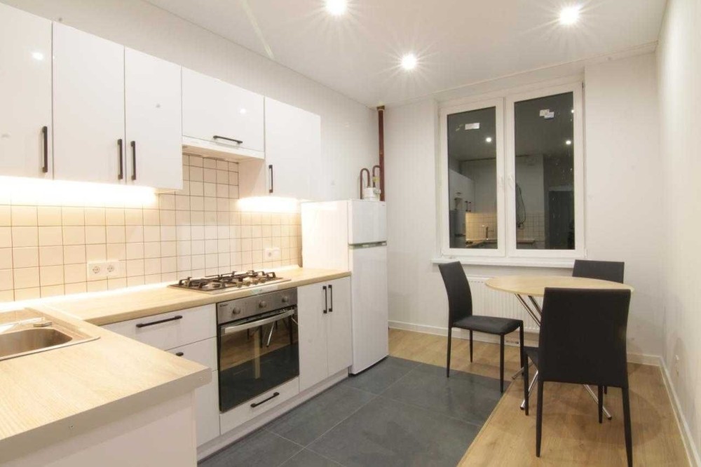 • Простора світла кухня: вбудовані меблі, духова шафа, варочна газова поверхня, витяжка, холодильник, стіл, стільці, італійський двоконтурний газовий котел Westen pulsar.