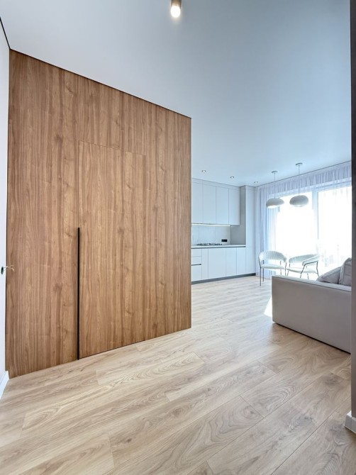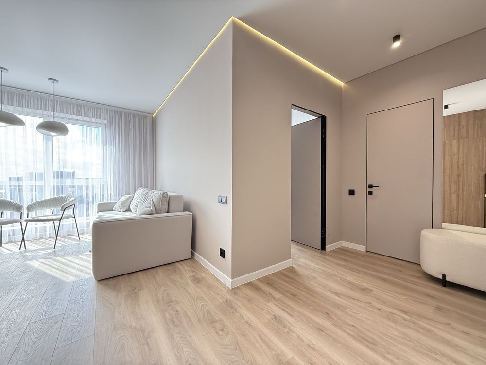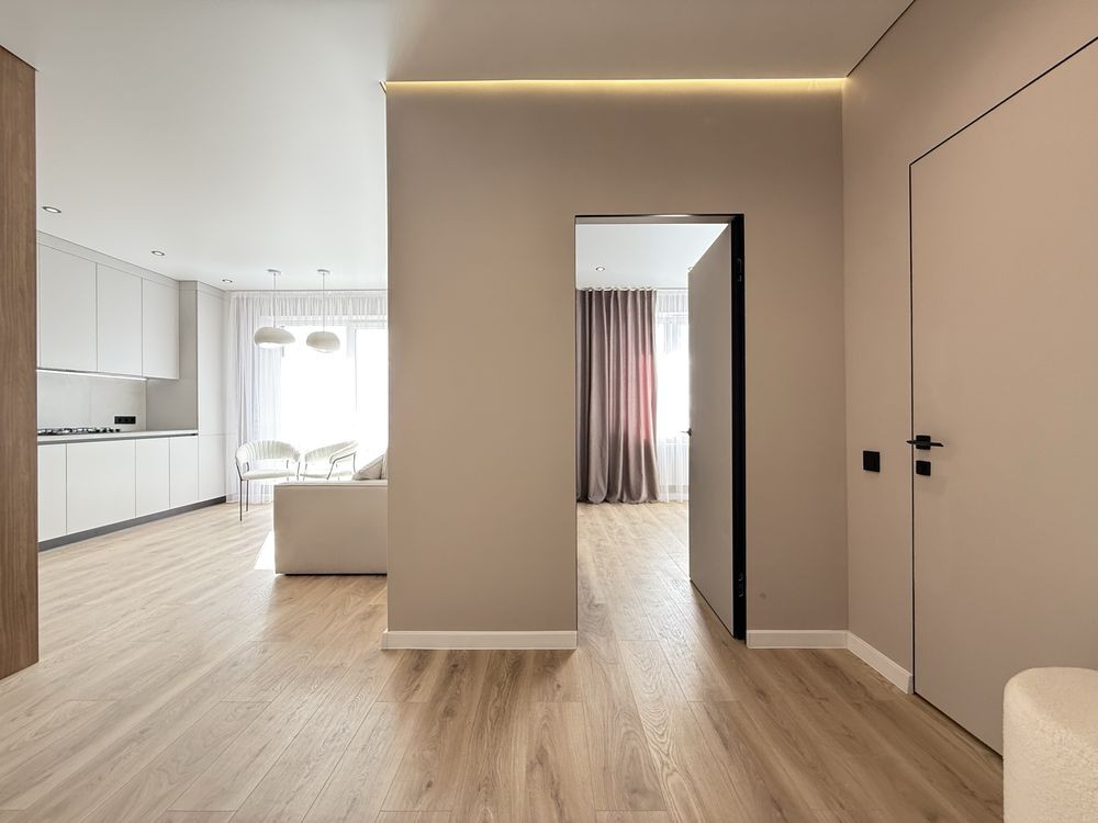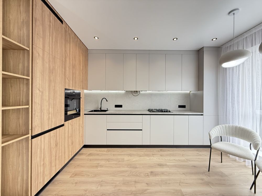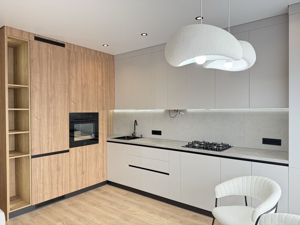 Ремонт зроблений з якісних матеріалів. Функціональна, простора кухня-вітальня з вбудованою технікою.