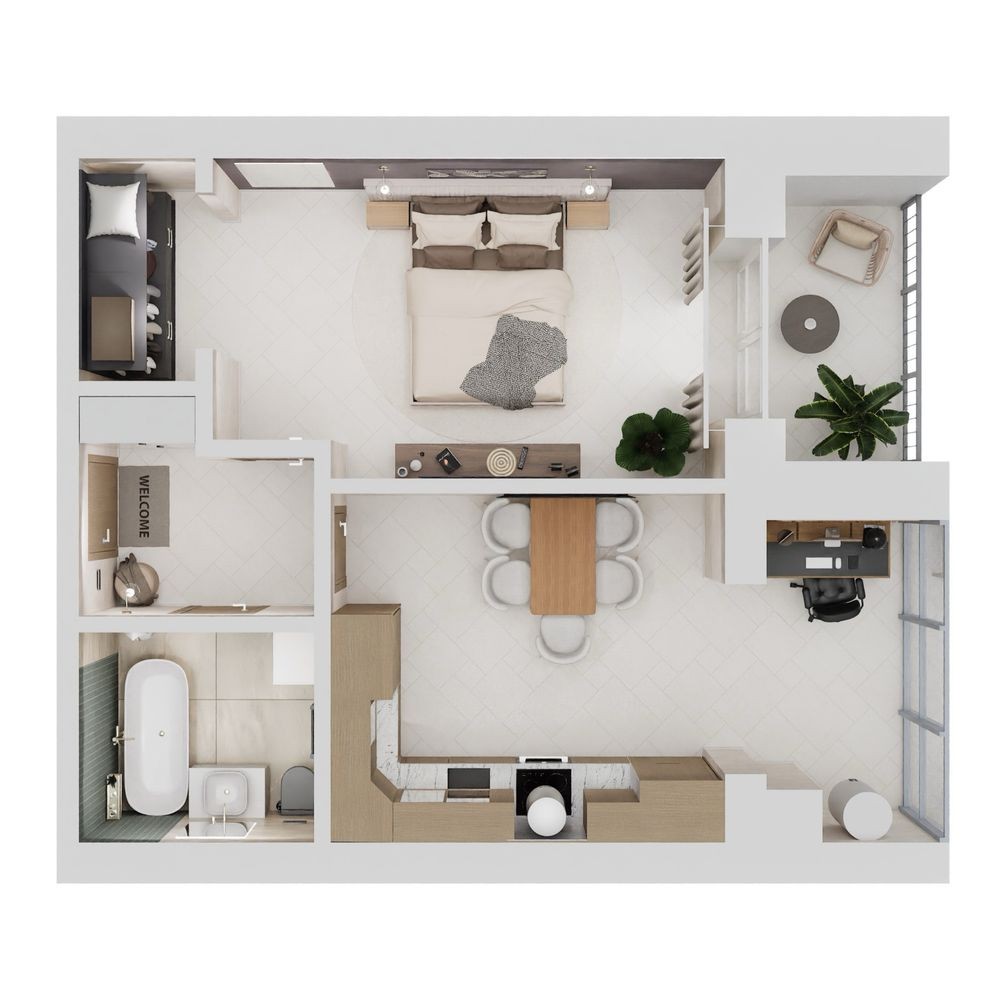 Зручна однокімнатна квартира з продуманим плануванням. Вікна виходять на південь. Кухня обʼєднана з панорамною лоджією. Спальня має власну гардеробну та вихід на балкон.