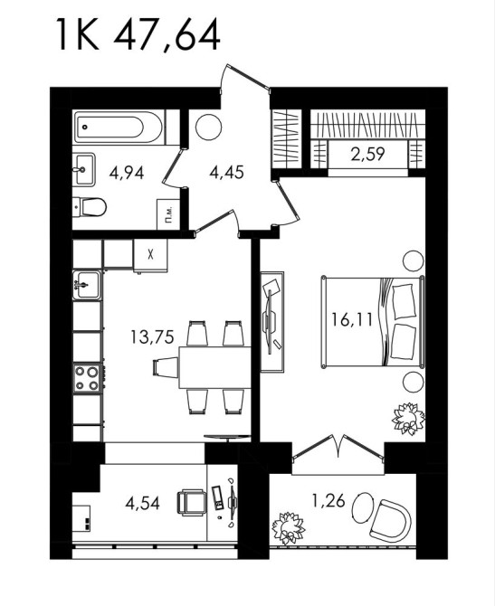 1 к.кв 47.94 м² ЖК «Нова Будова-2»